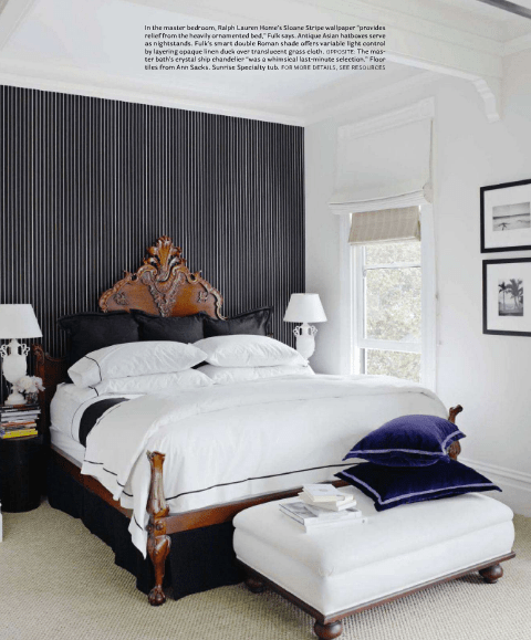 {love the juxtaposition of the ornate headboard against the pinstriped wallpaper}